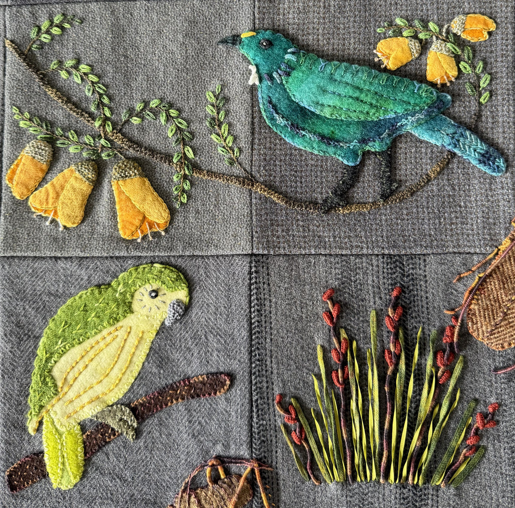 The wool is a mix of hand dyed vintage NZ wool and new wool with a variety of textures, and the threads are carefully chosen to bring out the beautiful realistic features of the wild-life on the quilt.